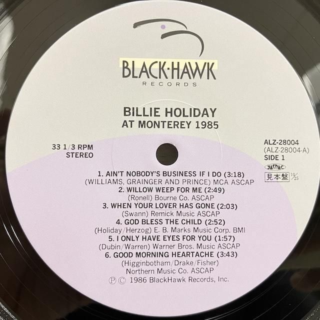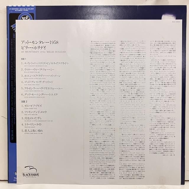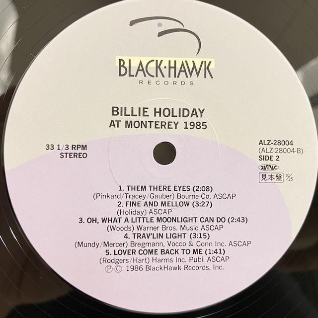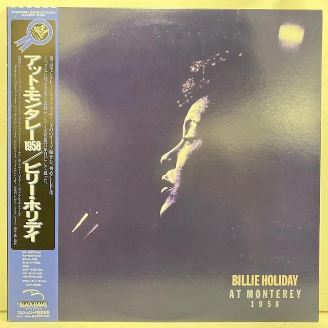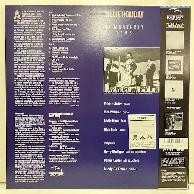 ・日本盤、85年プレス、見本盤。帯ライナー完品。シンガー、ビリー・ホリデイ、58年モントレー・ジャズ・フェスティバル実録作品。マル・ウォルドロン・トリオ、ジェリー・マリガン、ベニー・カーター、バディ・デ・フランコ参加。