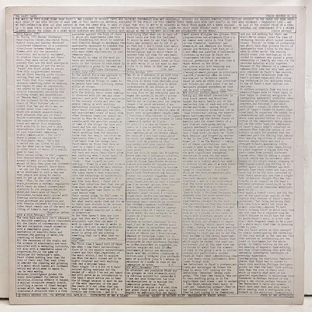 ・英オリジナル、1U/1U。クラウトロック・グループ、ファウスト、73年発表作品。未発表音源テープをヴァージンが勝手に編集した結果的に珍奇な仕上がりのコラージュ・アルバム。