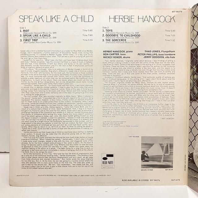 ・米盤、Ua Stereo、Vangelder刻印。ブルーノート社内袋。見開きカバーにカット、盤面a1に1mm程度の音に出ないプレスミス凸、b面ラスト音に出ない薄いスレ、他は良好。シカゴ出身のジャズ・ピアノ奏者、ハービー・ハンコックの68年名盤。ロン・カーター、ミッキー・ロッカー、サド・ジョーンズ、ピーター・フィリップス、ジェリー・ ドジオン 参加。