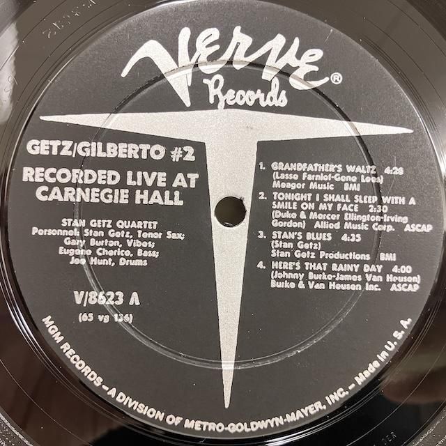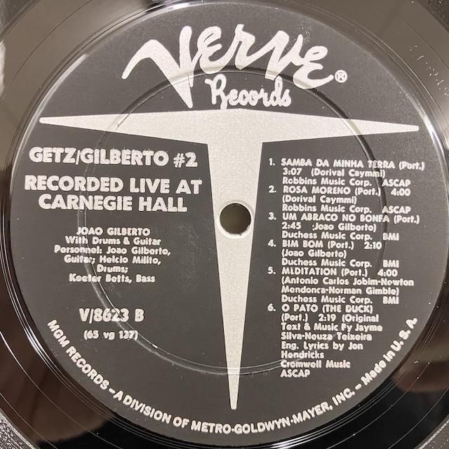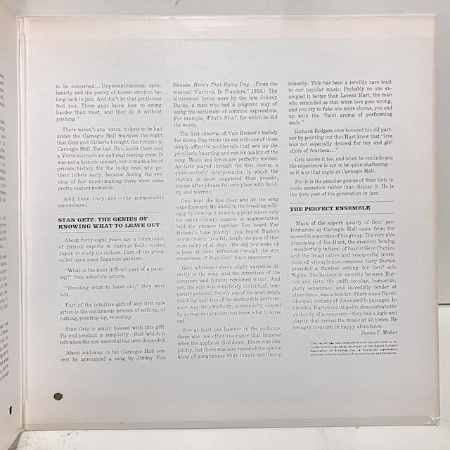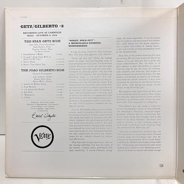 ・米オリジナル、Mgm/ Dg Mono、Vangelder刻印。B面音に出ない薄いスレ1本。見開きカバーにパンチ。テナー、スタン・ゲッツとギター/シンガー、ジョアン・ジルベルト、62年発表、ニューヨーク、カーネギー・ホールでのライブ録音作品。アストラッド・ジルベルト、ゲイリー・バートン、ユージン・チェリコ、キーター・ベッツ、 ジョー・ハント、エルシオ・メリト 編成。"試聴/Audio Sample"