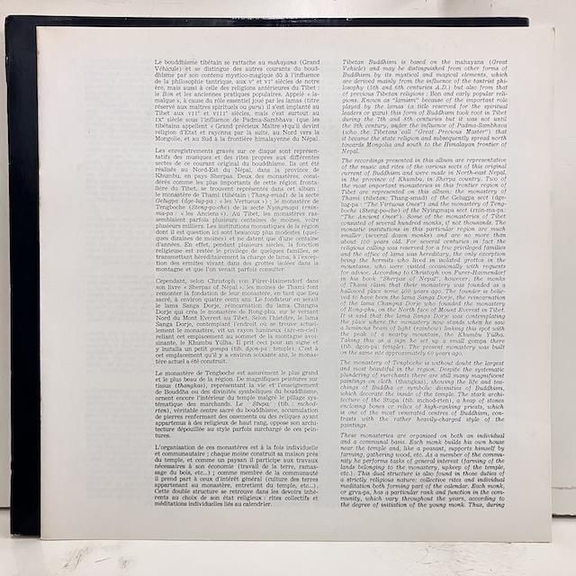 ・仏オリジナル。インサート付き。コーティング見開きカバー。B1に大ききく音に出ない薄い1cm程のスレ。映画監督Georges Luneauのチベット現地録音作品。The Gelugpa Sect、The Nyingmapa Sectの2部構成。