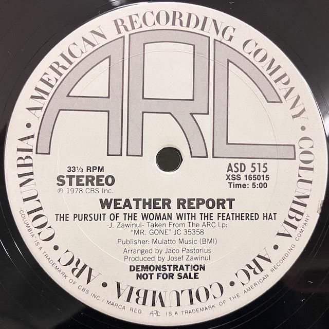 ・米オリジナル、2曲入りプロモ12インチ。盤面光の下で見える薄いスリーブスレ程度、aアタマ極軽度のソコチリ。カバー薄いスレ少々。フュージョン・グループ、ウェザー・リポート、78年録音、Mr Goneからのカット作品。セオ・パリッシュplay。cw- Pursuit of the Woman with the Feathered Hat。